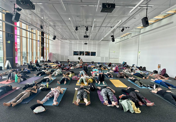 Ausbildung mit Veronika und Teilnehmenden und Veronika auf der Yoga World Messe 2025